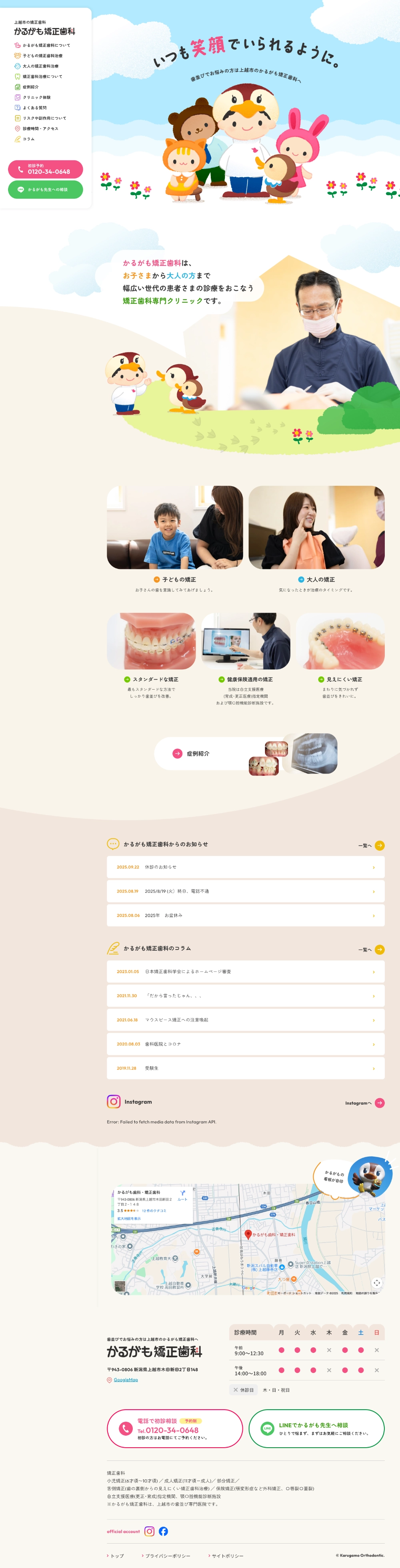 「かるがも先生」をキャラクターとしたイラストをベースに、親しみやすくかわいいデザインを採用しました。 矯正歯科に関する正しい知識や治療の流れなど、患者さんに役立つ情報も充実。 さらに、LINEと連動した相談機を取り入れることで、気軽に質問や相談ができる体制を整えています。 楽しさと信頼性を両立させ、初めての方でも安心して矯正治療を検討できるサイトに仕上げています。