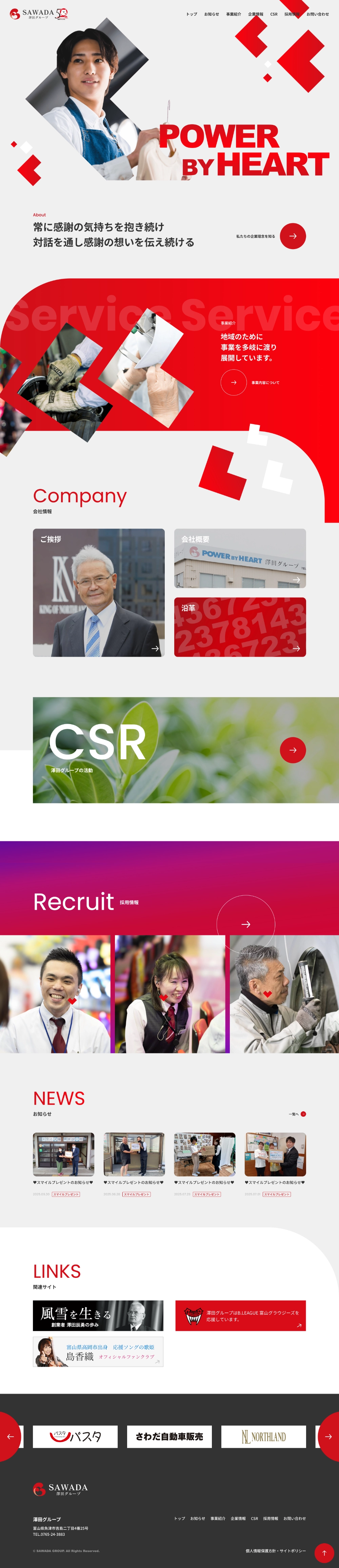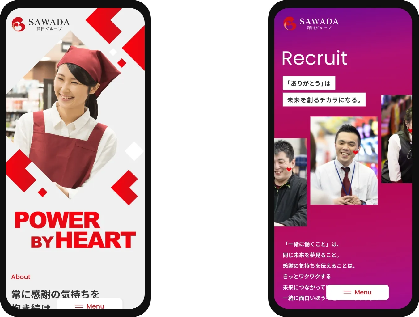 サイト全体としては「さわだグループ」が大切にしている地域とともに歩む姿勢を、伝えやすくするためにハートをモチーフにしたグラフィカルなデザイン表現にしています。