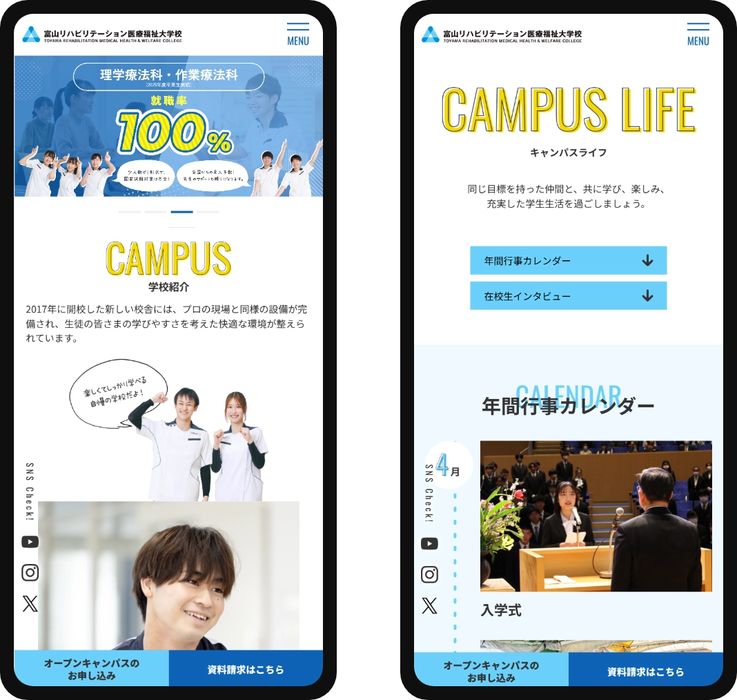 富山県富山市の旧総曲輪小学校跡地「レガートスクエア」の中にある「富山リハビリテーション医療福祉大学校」は、青池学園が運営する「富山調理製菓専門学校」とともに開校しました。医食同源の理念のもと、人が生きるうえでとても大切な「医療・福祉・食」の専門人材を育成しています。立地がよく設備が整った最新の校舎で、皆さんも学んでみませんか。オープンキャンパスは随時開催されています。今回のプロジェクトでは、以前リニューアルしたWebサイトを、現役生徒をモデルに撮影を行い、さらにブラッシュアップしました。楽しく、真摯に学ぶ、生徒さんの姿が印象的なサイトになっています。