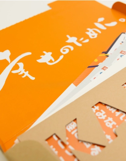 箱を開けると、文字で切り抜かれた特殊な表紙の会社パンフレットが目に飛び込みます。イントロダクションのリード文をあえて「チラ見せ」することで、思わず手に取って読み進めたくなる仕掛けを施しました。包装箱には十分な厚みを持たせ、同社の多種多様な商品ブランドパンフレットも一括して収納可能です。
